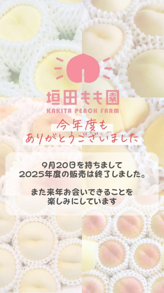 2025年度の販売は終了しました! 2025 9/20 2025年9月20日 9月20日をもちまして2025年度の販売は終了しました。 沢山のご来店ありがとうございました! また来年、皆さまにお会いできることを楽しみにしています✨️ 取り急ぎ販売終了のご連絡でした! また改めてブログにてご挨拶させて頂きます😊 垣田もも園 URLをコピーしました!